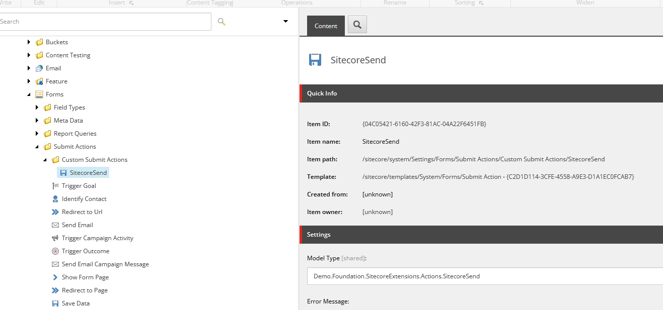 a. Create a submit action item under /sitecore/system/Settings/Forms/Submit Actions and add the Submit Action class to the model type field.