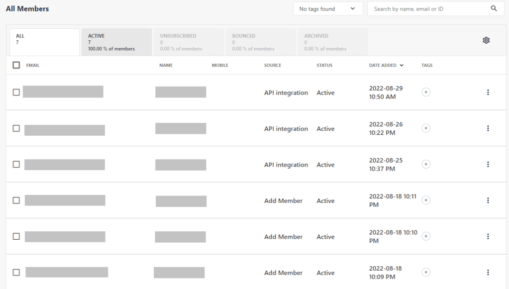 After submitting the data successfully, you will be able to see that the one with source as API integration are submissions via API from Sitecore form and others were done manually into email list.