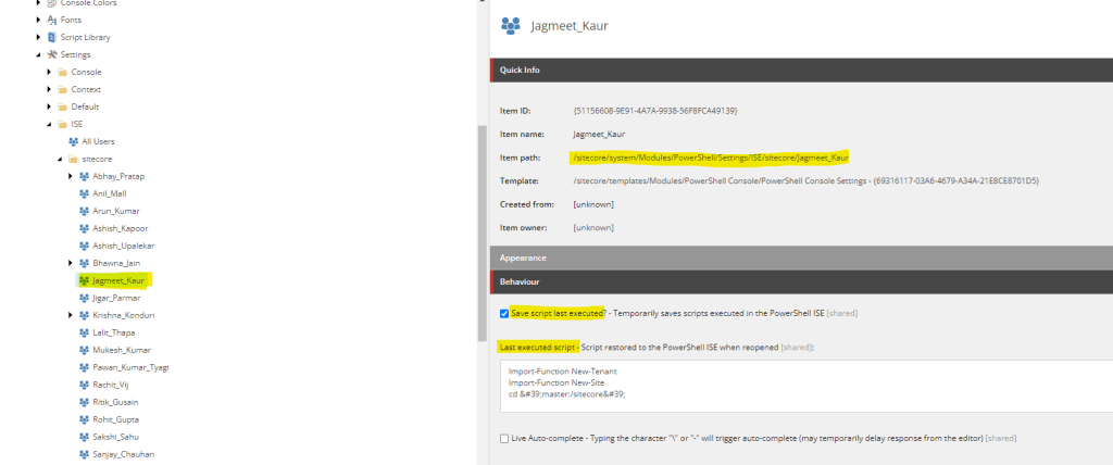 You will find this at location – /sitecore/system/Modules/PowerShell/Settings/ISE (refer below image)