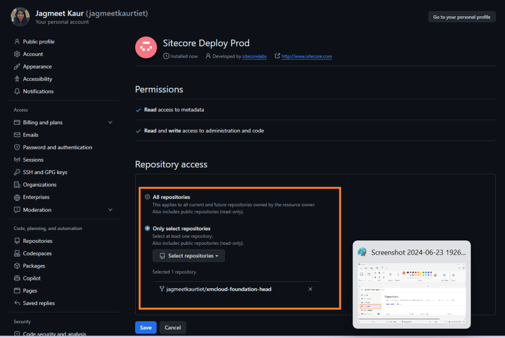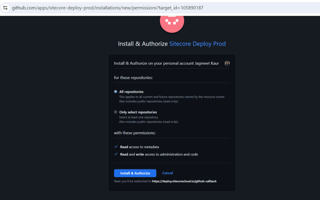 Then it navigate to GitHub account where it shows permissions and accesses to choose from. Choose the options and the save.