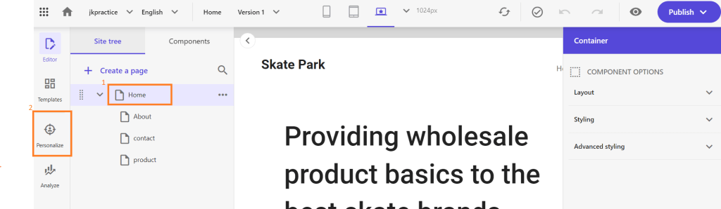 - Open your site in XM Cloud Pages, select the page where you want to implement personalization and then click Personalize present in left pane.