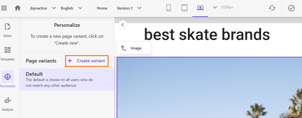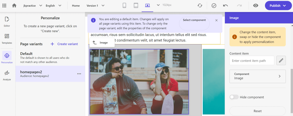 2. In personalize, select the component from the page and create the variant. There will a default variant present already for components that will be visible to all users. We have to create a new variant that will be visible after certain conditions are met.