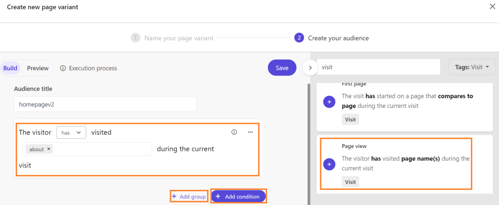 4. For this blog, I am adding the condition for page visits as below. It will show this variant if user come from about page.