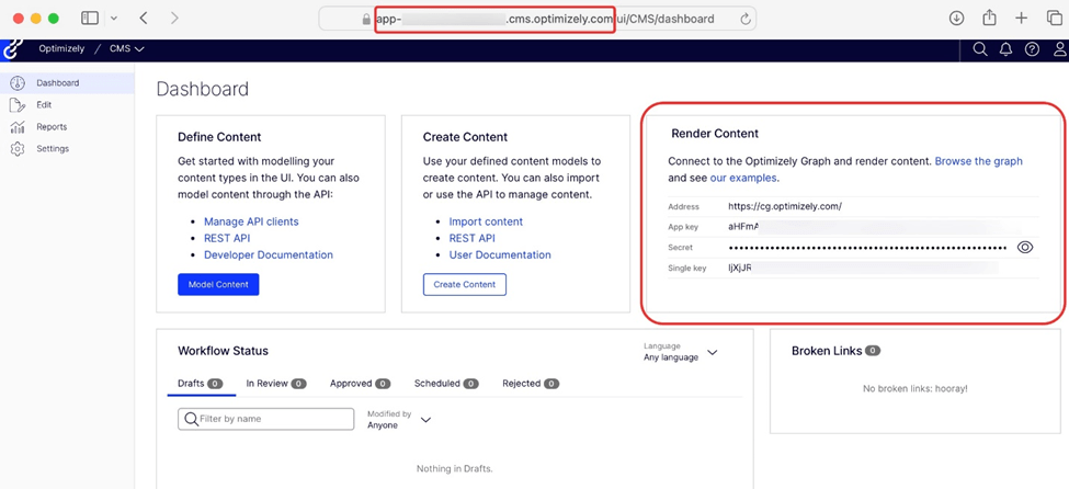 - OPTIMIZELY_GRAPH_APP_KEY: This key is also available in the CMS Dashboard, located within the Render Content section.
