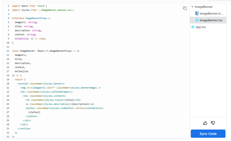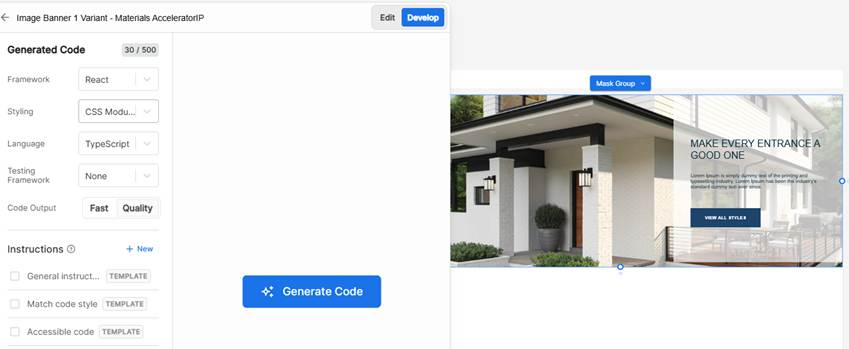 8. Review the generated code. You can customize it by choosing different UI libraries, styling solutions, and quality modes. If needed, you can enter additional prompts to modify the code further